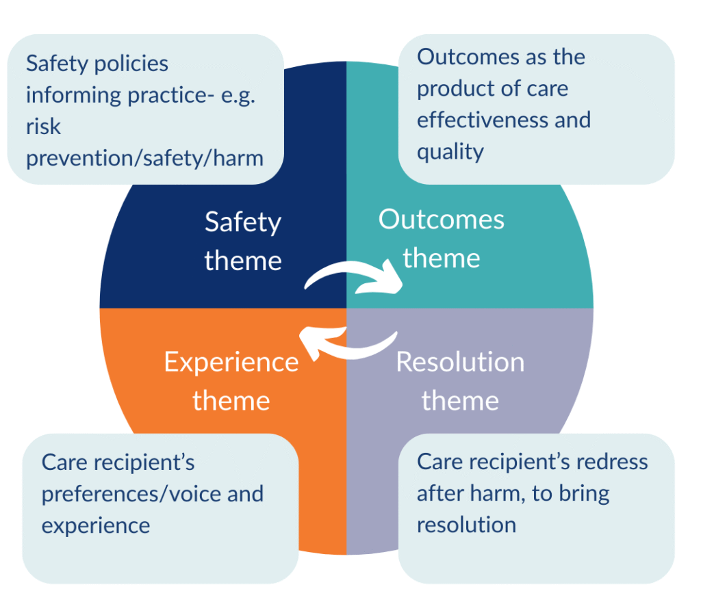 Our research into quality is organised around four themes: Safety, Outcomes, Experience and Resolution as illustrated below:
